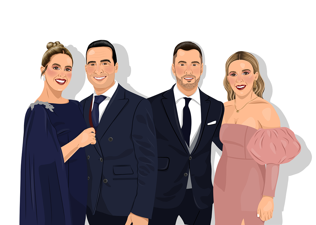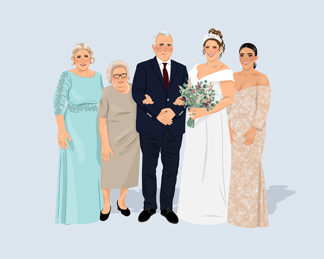 Este servicio se aplica cuando deseas combinar varias fotos independientes en una sola ilustración. Si no tienes una imagen donde las personas estén juntas, no te preocupes: puedo unir las fotos separadas para crear una ilustración única, como si estuvieran juntas desde el principio.